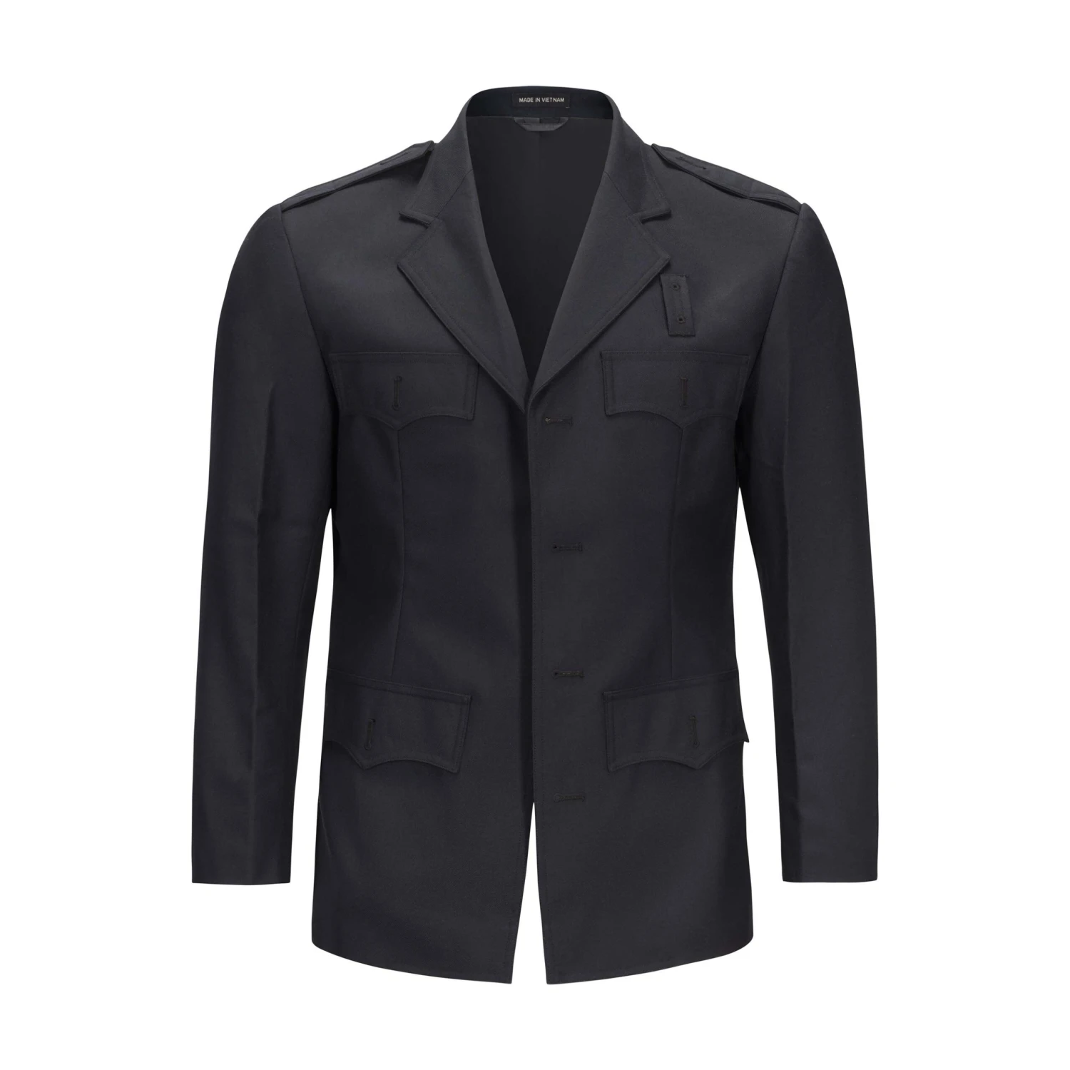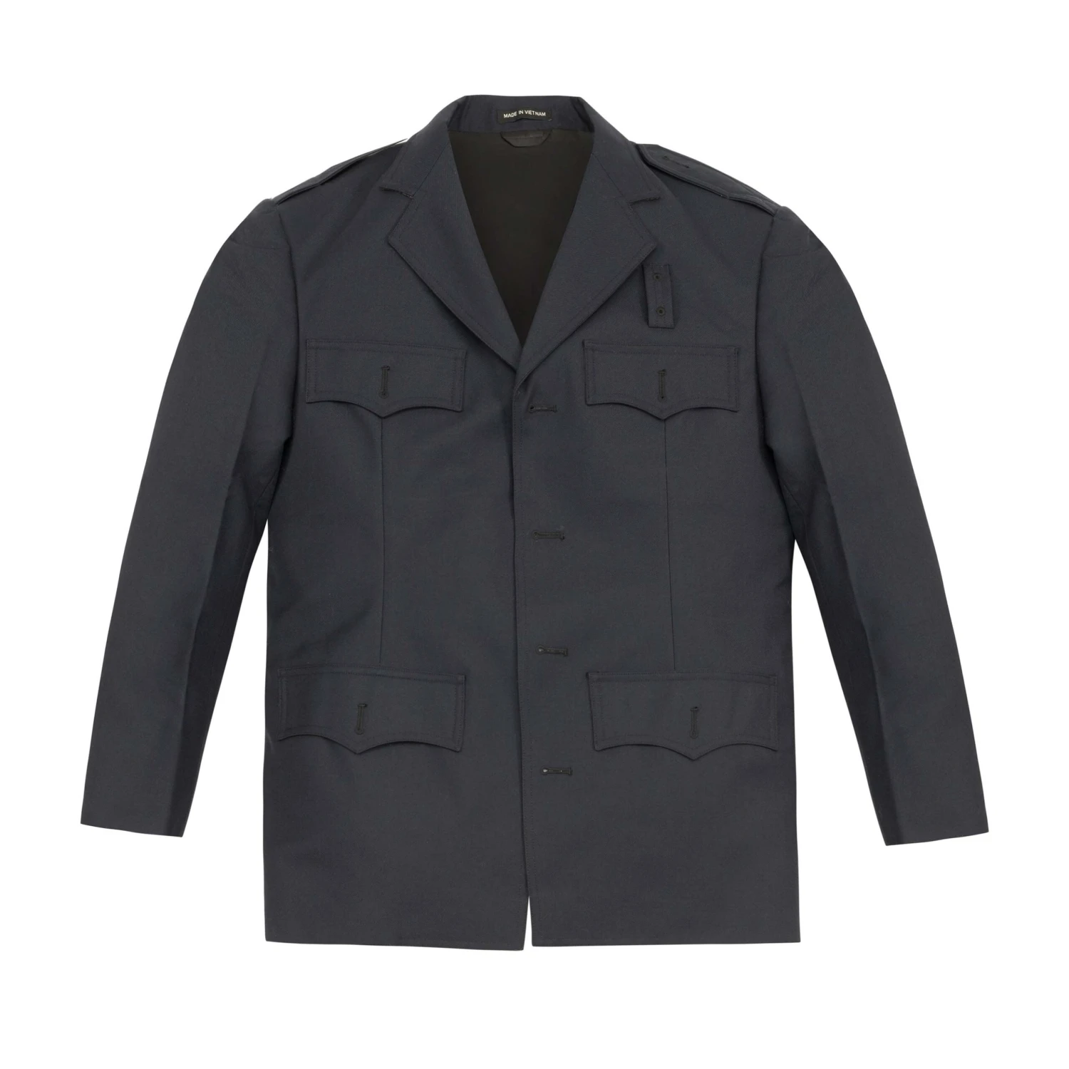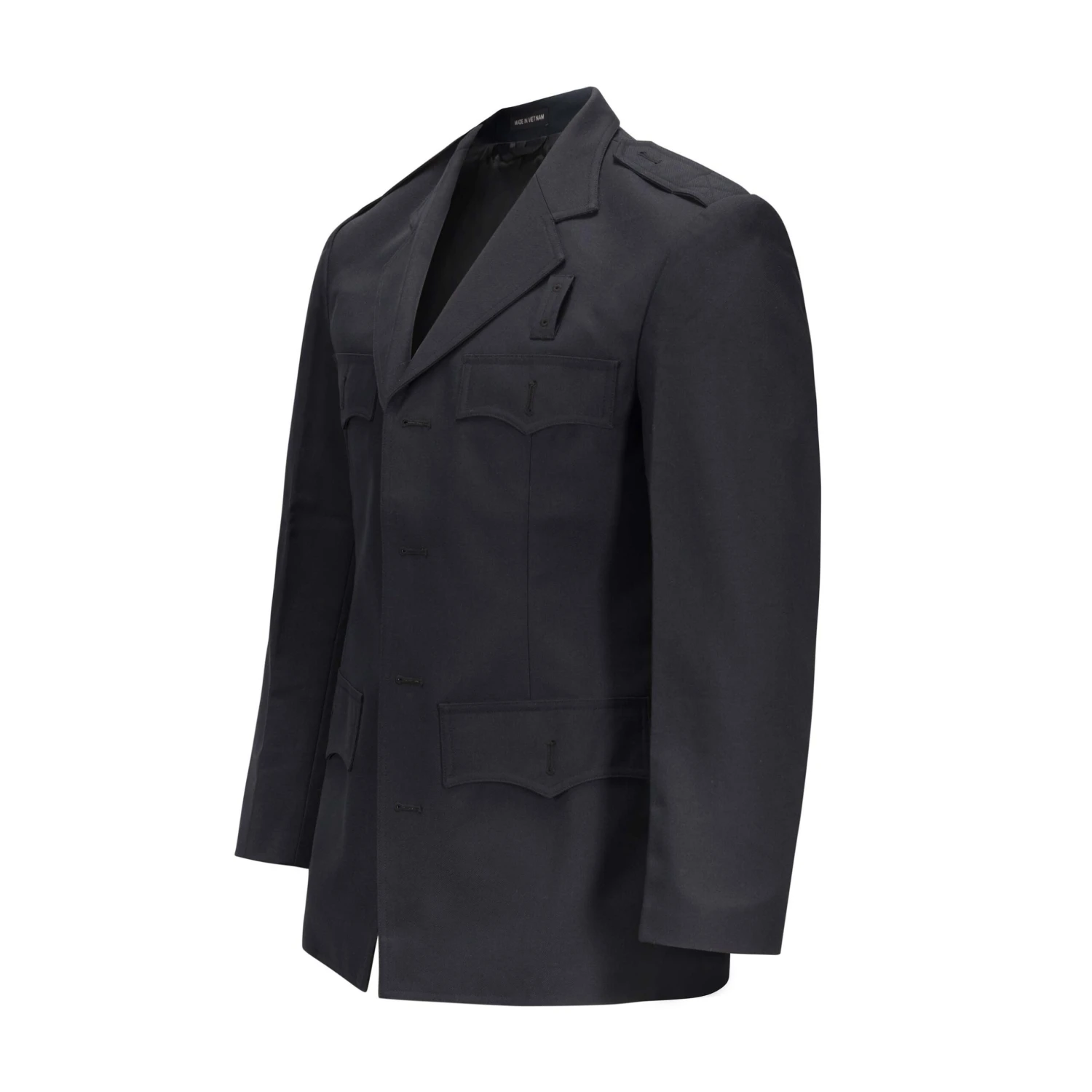 Thoughtful features like hidden zippered side openings for equipment or weapon access/display, a hidden internal breast pocket, and a fully-lined taffeta interior abound. The 55/45 Wool Blend serge weave fabric is pitch-perfect for all season wear.