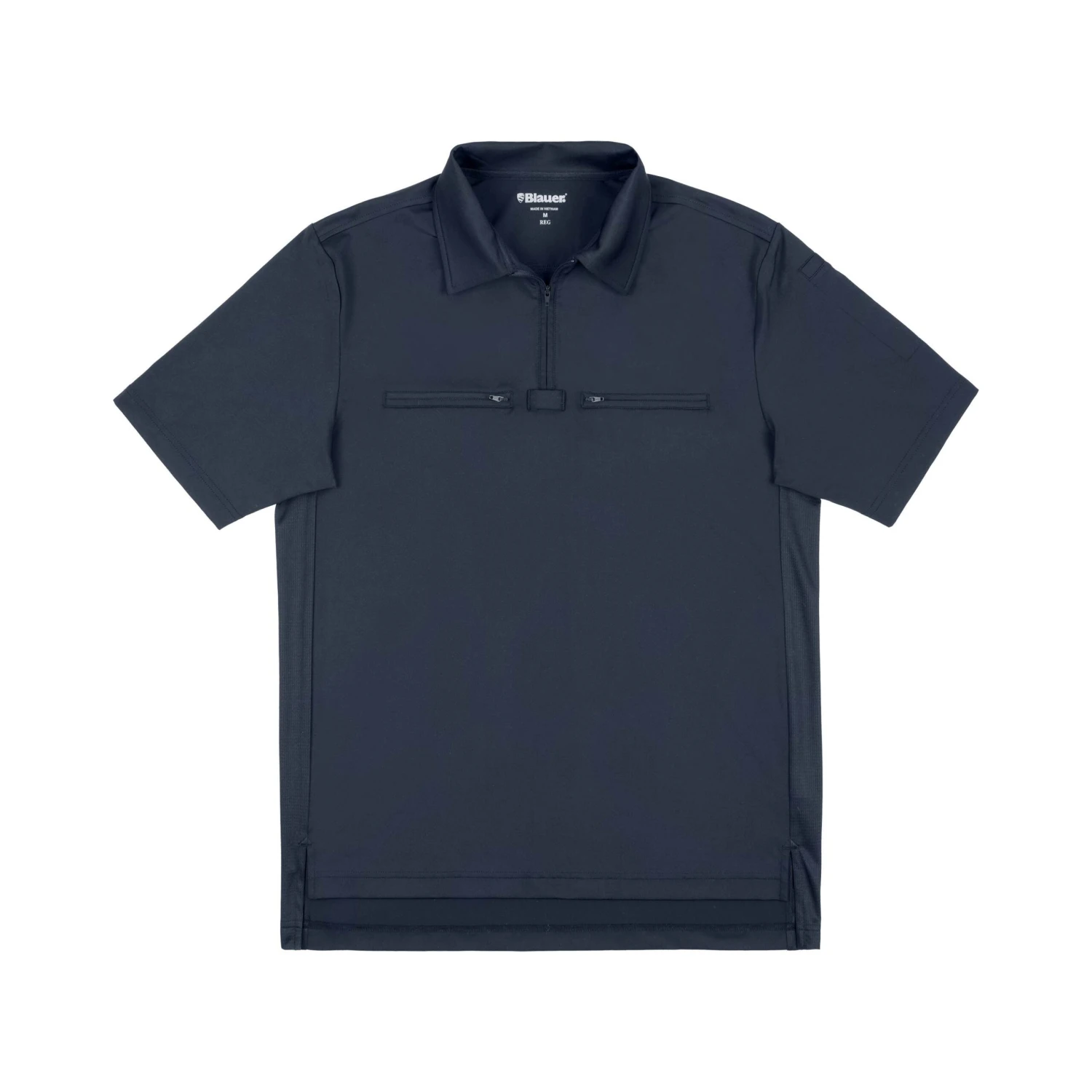 Taking cues from the performance sports world, Blauer’s Performance Pro Zip-Front Polo features an easy-open quarter-zip construction with nylon zippers that won’t snag on your hair or undershirts. Side mesh inserts further enhance breathability and your range of motion by providing extra “give” as you pivot your torso. Dual zippered chest pockets securely hold your notebooks and other gear with room to spare, and the split-tuck tail design helps keep things tucked in even during heavy activity. Finally, a wicking and anti-odor finish helps keep you fresh. Get yours today.