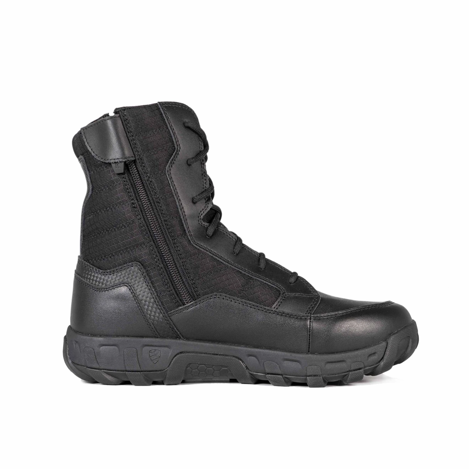 Full grain leather mud guards and polishable toe give Rift WP a classic tactical look. PU foam sock liners provide cushion and comfort for prolonged standing. Rift’s all terrain outrigger lugged outsole provides lateral stability and grip on any surface. The padded and ribbed uppers protect the ankle and provide support and the reinforced heel counter works like a shoehorn when donning. Plus, the Achilles Assist Opening gives you an “unbreakable bootstrap” to pull on to don your boot quickly and easily.
